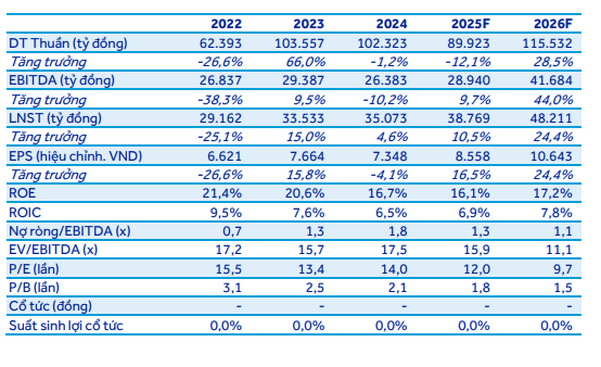 Biên lợi nhuận gộp được dự báo cải thiện đáng kể nhờ cơ cấu sản phẩm cao cấp và các thương vụ bán sỉ quy mô lớn. Cùng với đó, chỉ số EPS dự kiến đạt 8.558 đồng/cổ phiếu (+16,5%), ROE duy trì ở mức 16,1% và ROIC đạt 6,9%, phản ánh khả năng sinh lời ổn định của doanh nghiệp.